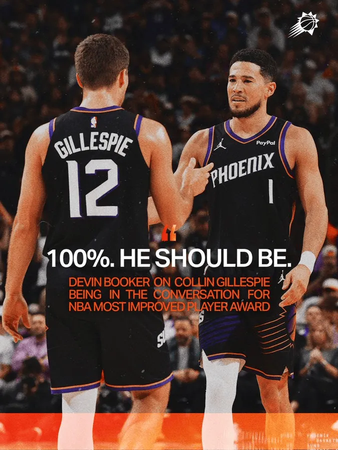 布克:吉莱斯皮绝对有机会冲击今年的最快进步球员奖